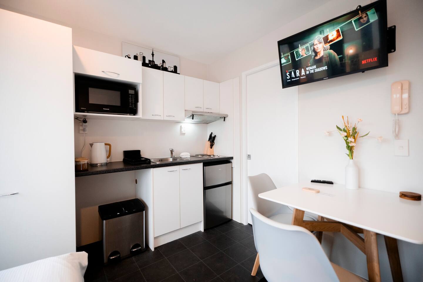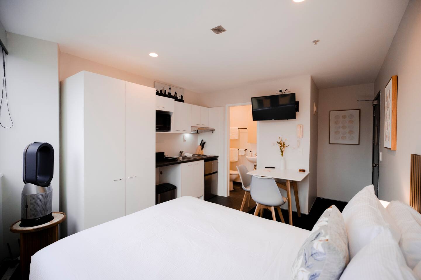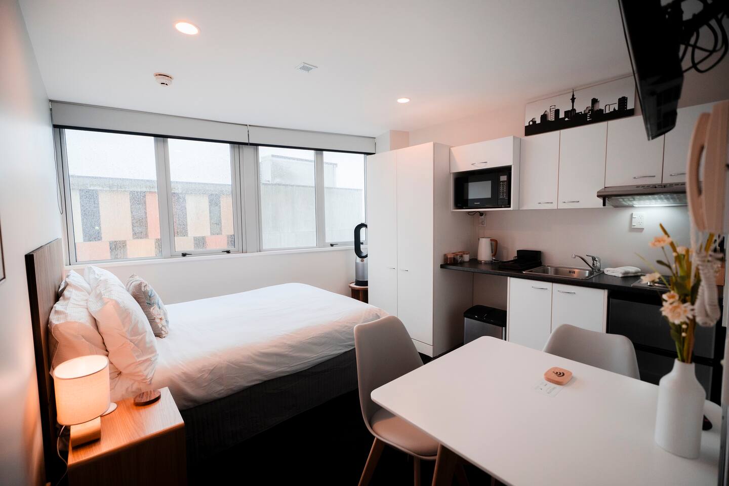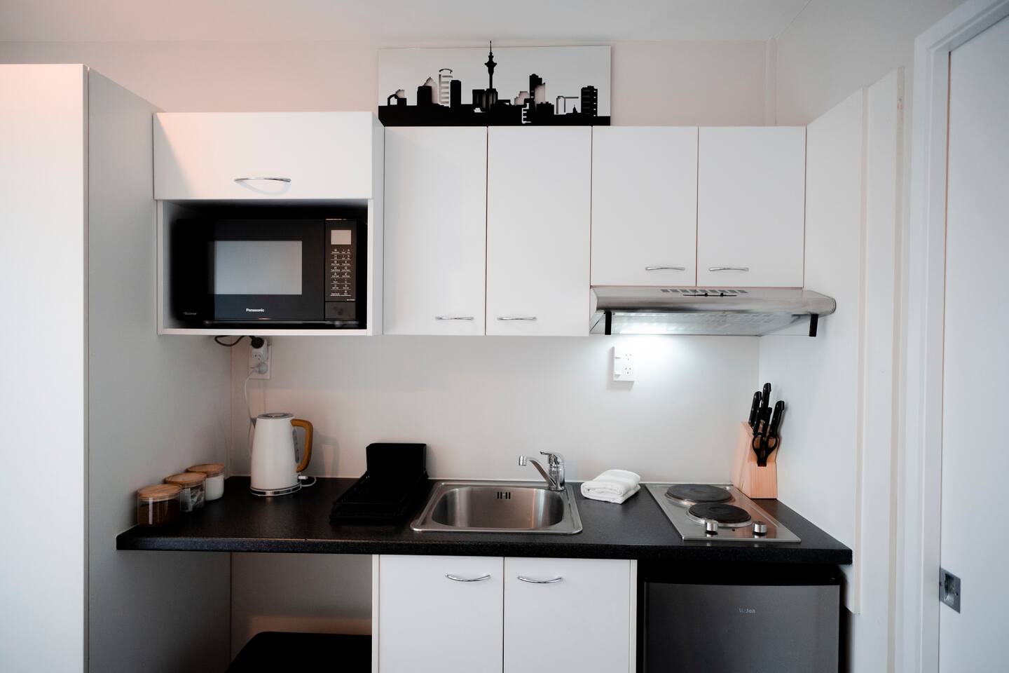 Located a short walk to Queen Street, Auckland Universities and Auckland Hospital, this is a great base if you're visiting Auckland and want to be close to transport, shopping & restaurants. A complimentary, secure parking space in the basement is included during your stay. In short, the apartment has; * City and harbour views looking out to Waiheke Island from your window * Unlimited fast wifi internet * Unlimited on demand movies and TV shows from Netflix * 32" Smart TV * Air Purifier (hot and cold) * Fully furnished kitchenette including DeLonghi appliances, fridge/freezer and microwave/oven * Bistro dining table * Shower * Premium Egyptian cotton bathroom towels * Bed linen and duvets * Outdoor swimming pool access * Highly secure building; swipe card required for access to the lobby and lifts. BEDROOM Is cosy with a comfy double sized bed with luxurious Egyptian cotton sheets and linen duvet. There's a wardrobe where you'll find lots of hanging space for your clothes and the ironing board & iron. Each bedside table has a wireless phone charger. Complementary laundry powder, milk, premium tea & coffee are provided.