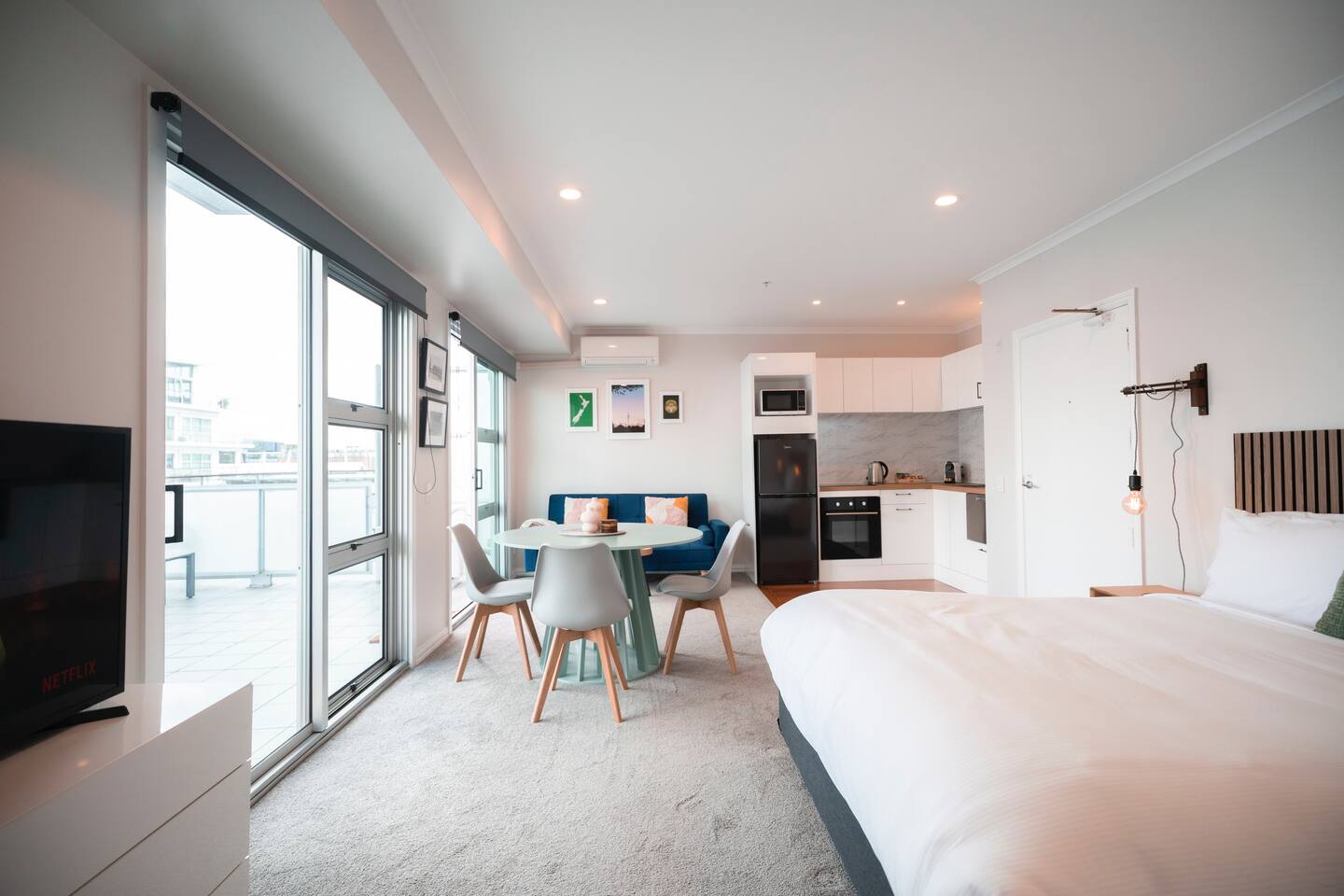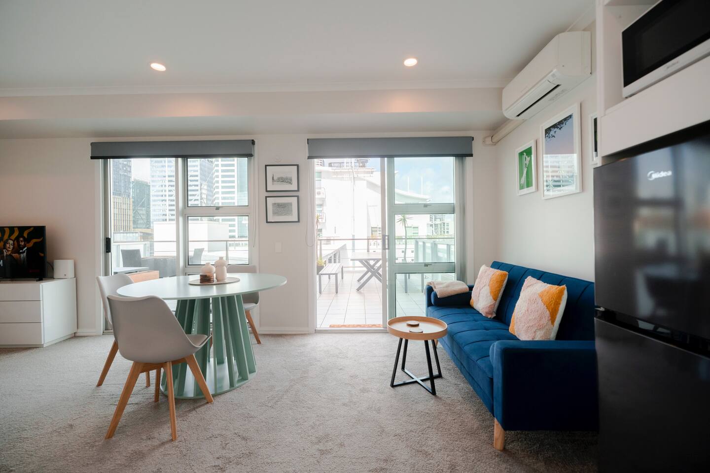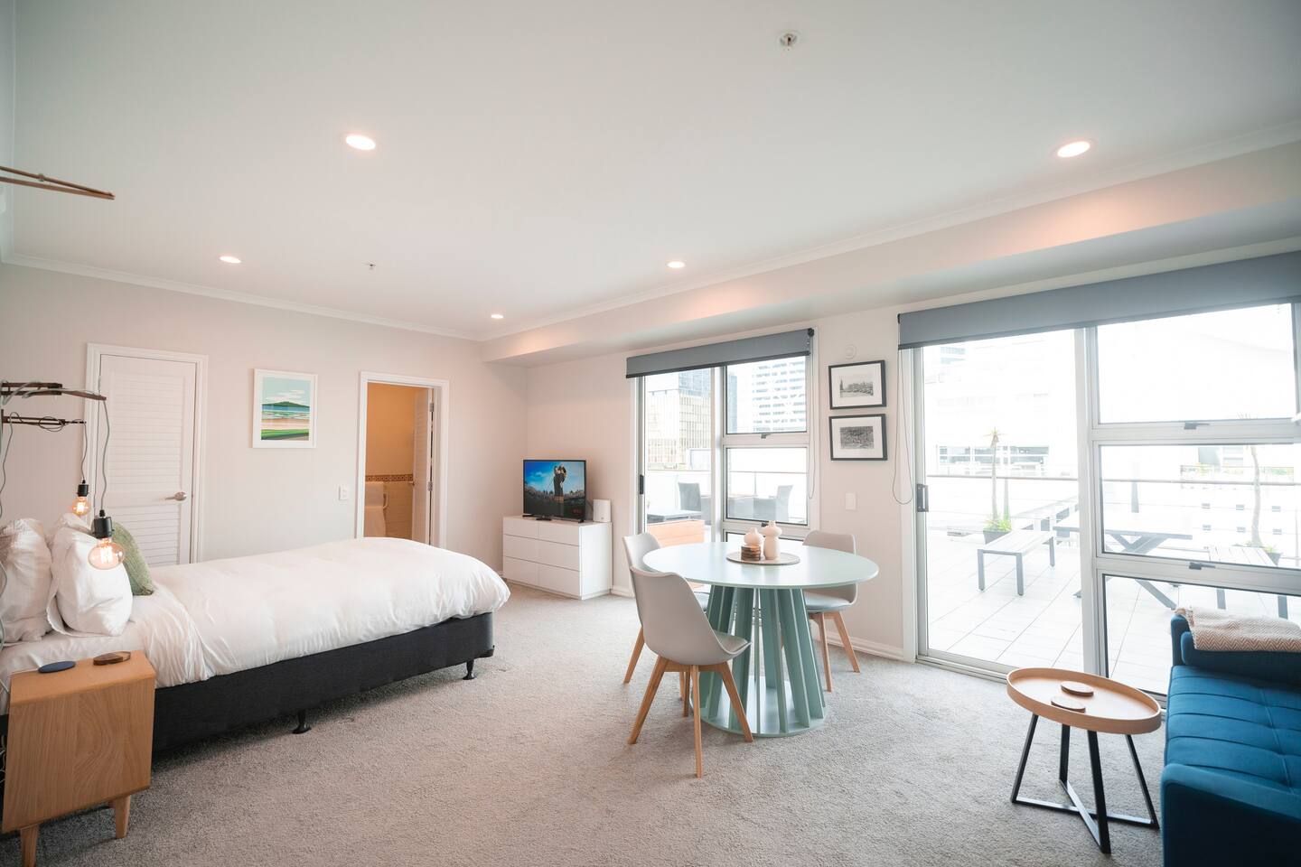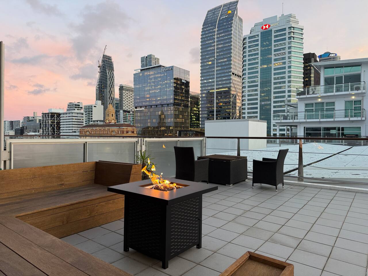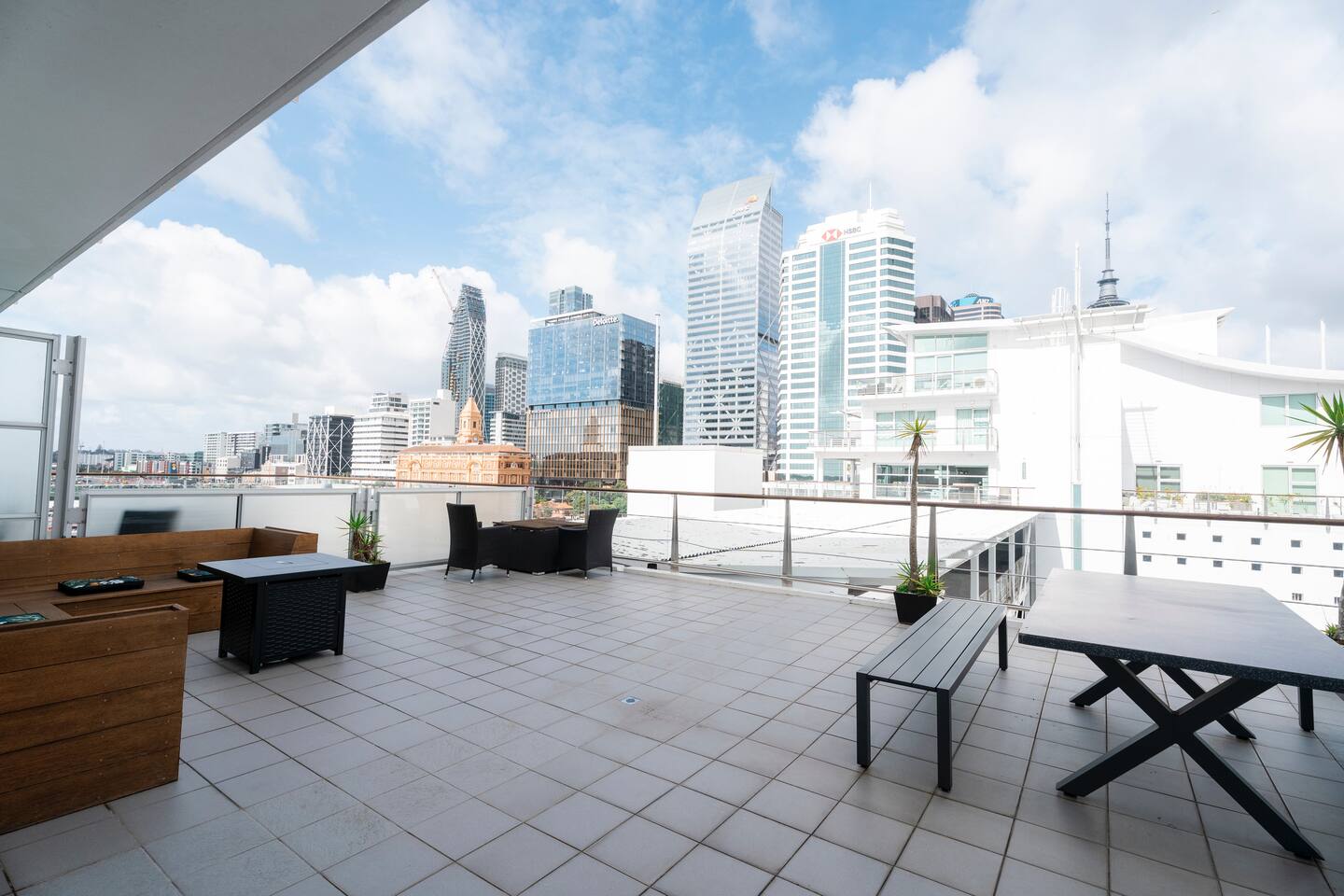 Less than a 5 minute walk to Britomart and Queen Street, this is a great base if you're visiting Auckland and want to be close to transport, shopping & restaurants. Compliment a romantic getaway with the outdoor fire pit whilst soaking in the harbour and city skyline. Located in the entertainment and tourist districts of Auckland with prime bars, restaurants and cafes in close proximity. In short, the apartment has; * Harbour and city views from the large private terrace * View of the SkyTower from your bed * Unlimited fast wifi internet * Unlimited on demand movies and TV shows from Netflix * 43" Smart TV * Air Conditioning (hot and cold) * Fully furnished kitchen including DeLonghi appliances, Nespresso machine, oven, dishwasher, fridge/freezer and microwave * Shower * Premium Egyptian cotton bathroom towels * Bed linen and duvets * Washing machine and dryer * Outdoor fire pit * Highly secure building; swipe card required for access to the lobby and lifts. BEDROOM Is spacious with a comfy queen sized bed with luxurious Egyptian cotton sheets and linen duvet. In your wardrobe you'll find relaxing waffle robes to enjoy during your stay, lots of hanging space for your clothes and the ironing board & iron. Each bedside table has a wireless phone charger. Complementary laundry powder, milk, premium tea & coffee are provided.
